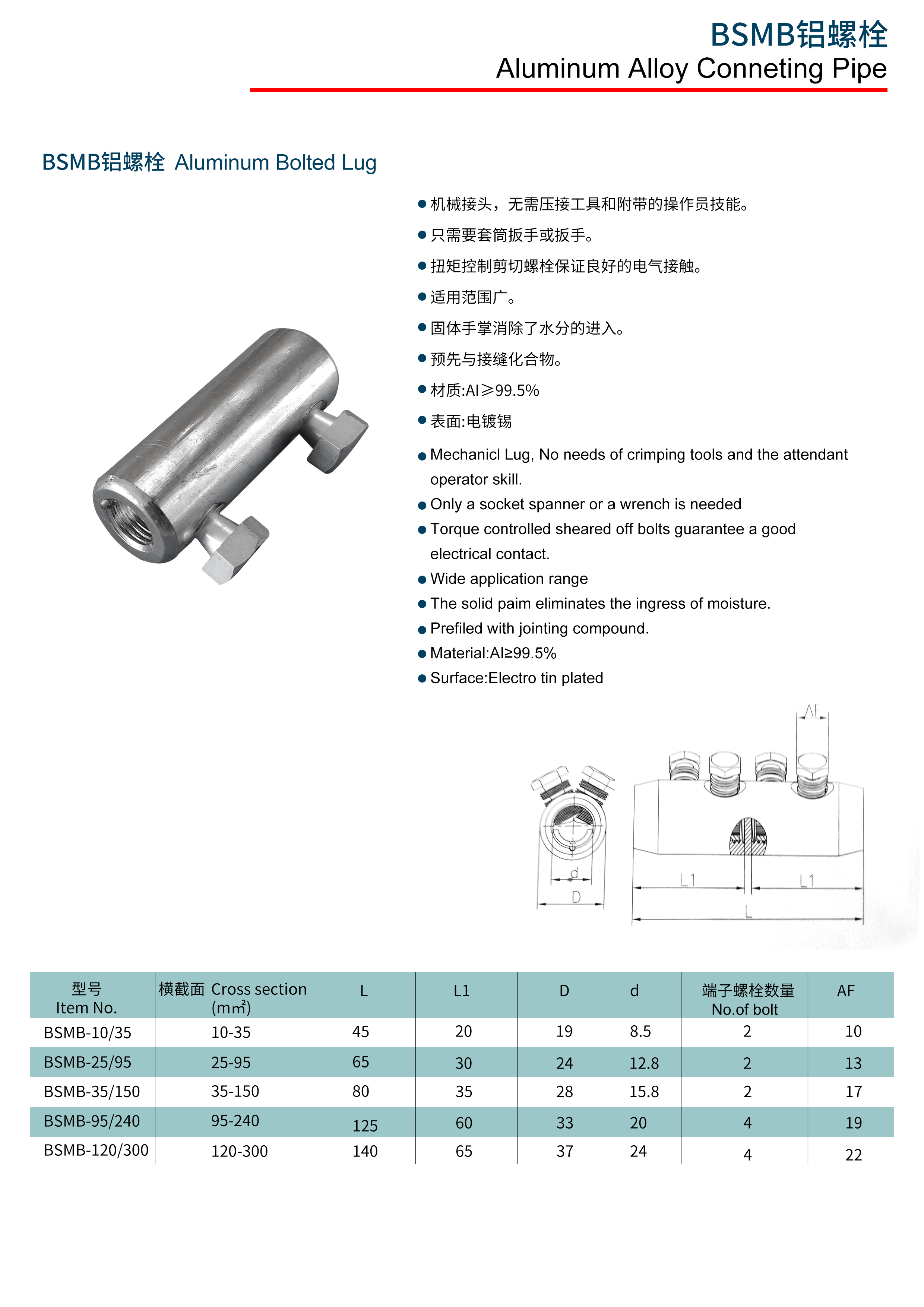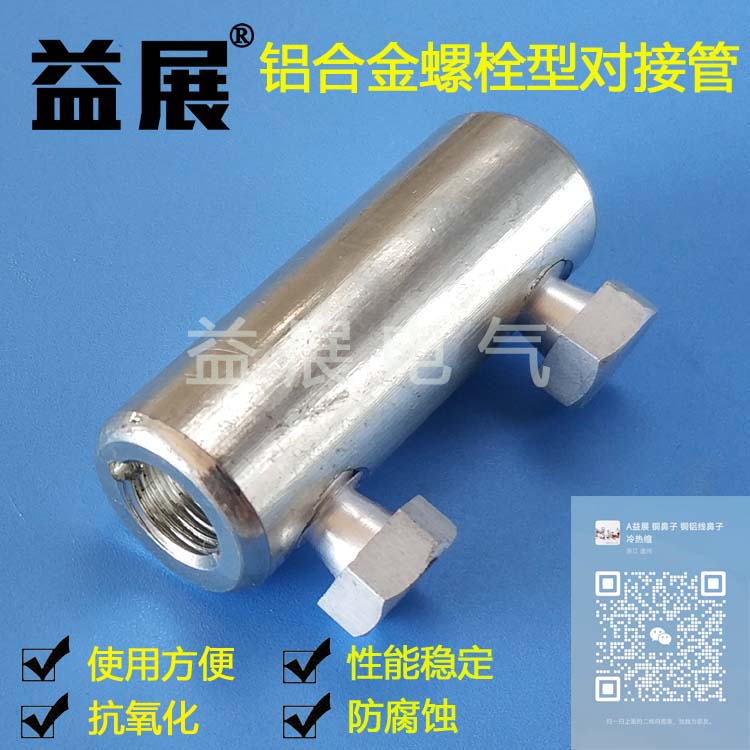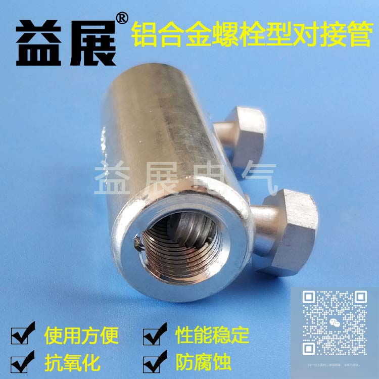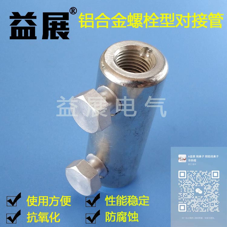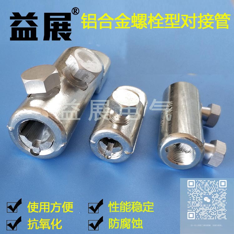 鋁合金螺栓型對接管 鋁直通對接管 鋁接線管 鋁合金端子,材質:鋁合金 用途:可用于鋁合金電纜連接。 特點:機械接頭,無需壓接工具和附帶的操作員技能。 只需要套筒扳手和扳手就可操作。 扭矩控制剪切螺栓保證良好的電氣接觸。 適用范圍廣,表面電鍍錫。