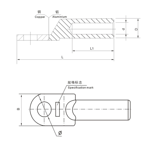 用途 :DTL系列銅鋁接線端子適用于配電裝置中各種圓型,半圓扇型鋁線,電力電纜與電氣設備銅端的過渡連接。使用鋁材為L3,銅材為T2。產品采用磨擦焊工藝制造,具有焊縫強度高,通電性能好,抗電化腐蝕,使用壽命長等等特點。